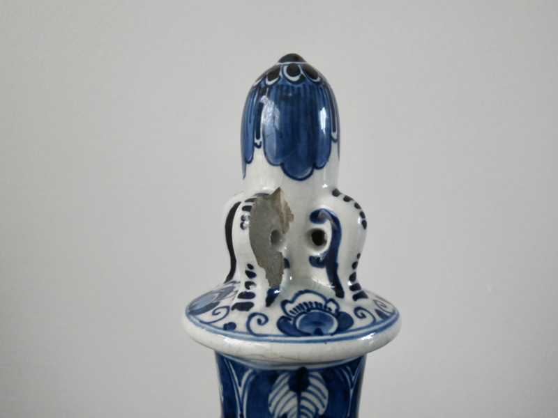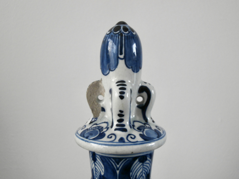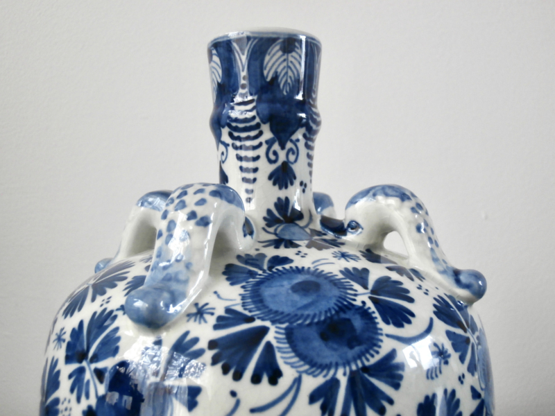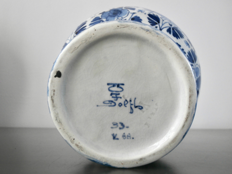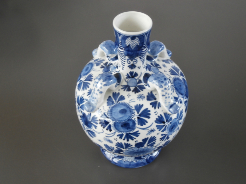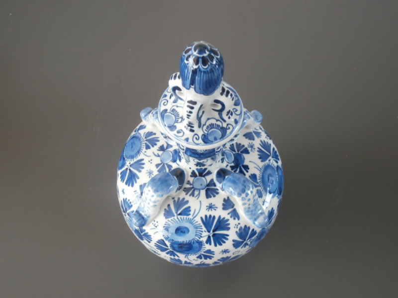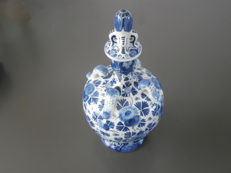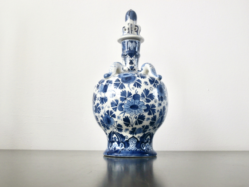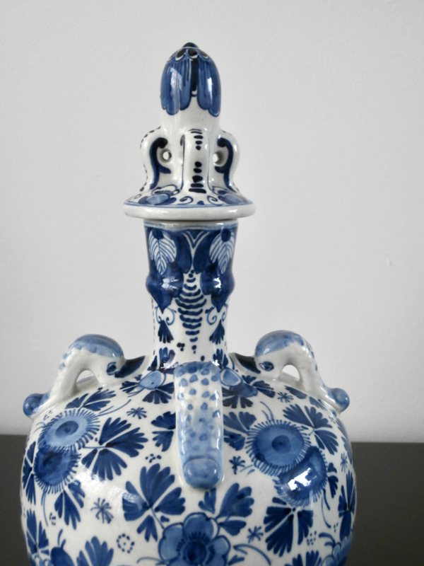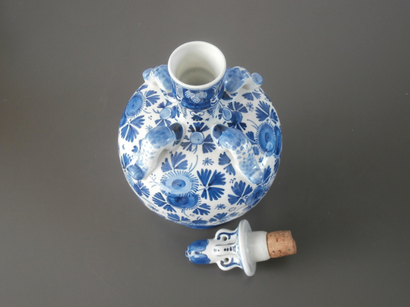 Een zeer zeldzaam object uit de Arts-en-Craft periode van De Porceleine Fles. Zeker met stop zul je dit model niet of nauwelijks aantreffen. Het model, bekend als V 12 Kruikje dolfijn met stop, is hier gedecoreerd met een bloemenmotief. Opvallend zijn de vier dolfijntjes die op de schouder zijn gevormd. Deze vormen komen ook terug in de stop. Op de hals zit een verdikte rand. Hals en voet zijn rijk beschilderd.