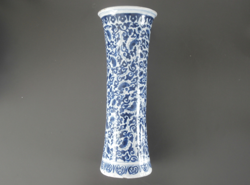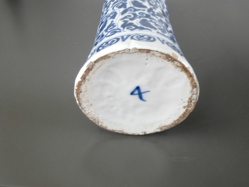 Een Delftse bekervaas van formaat. Deze octagonale licht uitlopende vaas heeft een hoogte van 37 cm. en een uitloop naar 14 cm. Het is onderdeel geweest van een imposant kaststel uit de 18e eeuw. De volle decoratie bestaan uit krulmotieven die afkomstig zijn uit de aziatische decoratie, met daartussendoor geweven fijne bloemtakken. De voetrand en bovenrand zijn beide voorzien van een band met zich herhalende figuren en twee lijnen. Vanbinnen zijn de draairingen zichtbaar, maar aan de buitenzijn zijn er acht lengtepanelen voelbaar. Aan de onderzijde is het cijfer 4 onderglazuur gezet. Dit is geen merk maar een productie aanduiding. De conditie van deze vaas is uitstekend, geen restauraties slecht de gebruikelijke lichte glazuuefritting.