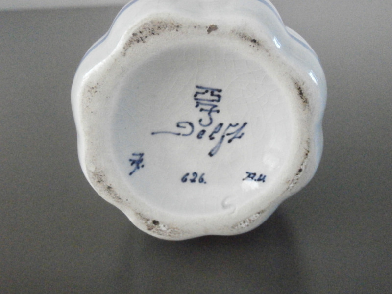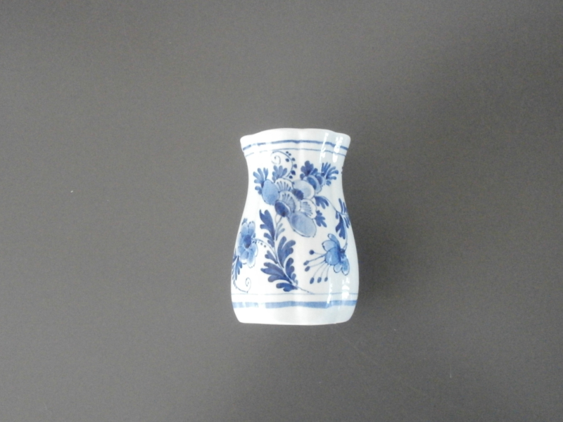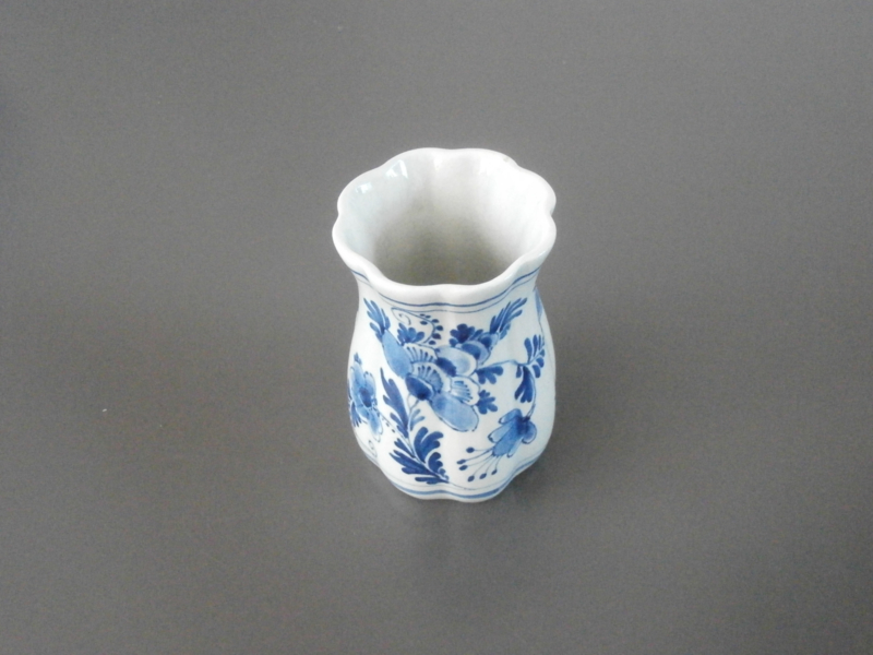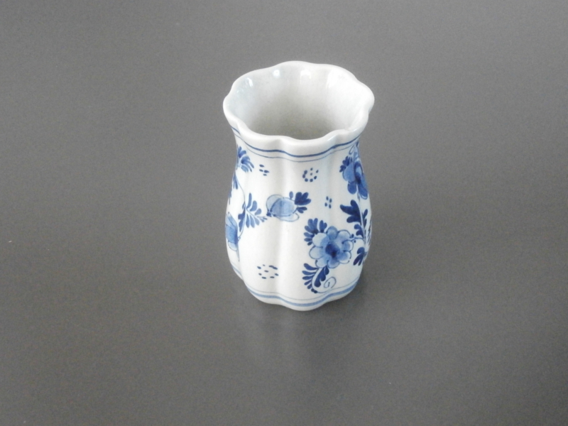 Een bescheiden vaasje, of lepelvaasje met acht vertikale plooien en een bloemdecoratie. De hoogte is 9,5 cm en de breedte 6 cm. Heeft een vlooienbeetje aan de rand en wat ouderdomscraquelé.