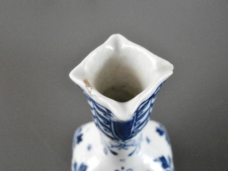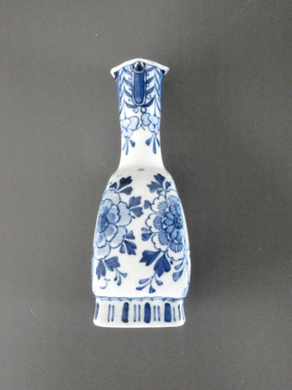 Een zeldzame tafelflacon van een mogelijke cruetset. Model IV 32 tafelflacon. Er hebben twee schilders aan gewerkt een heeft de twee cartouches geschilderd met aan een zijde een molengezicht aan het water, en aan de andere zijde een waterlandschap. De florale versieringen aan de zijkanten en op de hals, zijn door een andere schilder gedaan. Het flesje is niet ongeschonden door de tijd gekomen, twee van de vier tuitjes hebben een chipje en eenaan binnenkant rand. Voor een liefhebber is het flesje zeker nog interessant. Kijk goed naar de foto's.