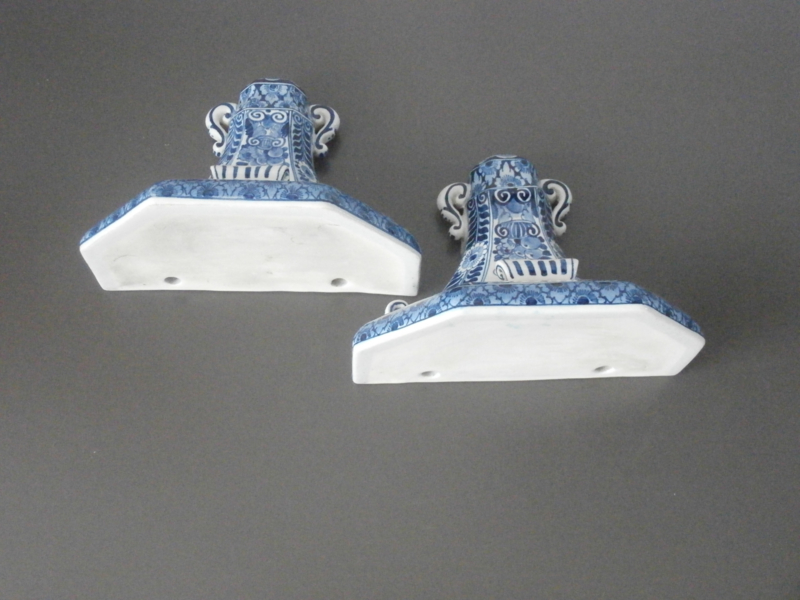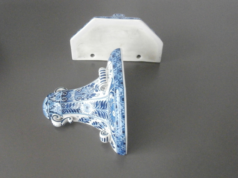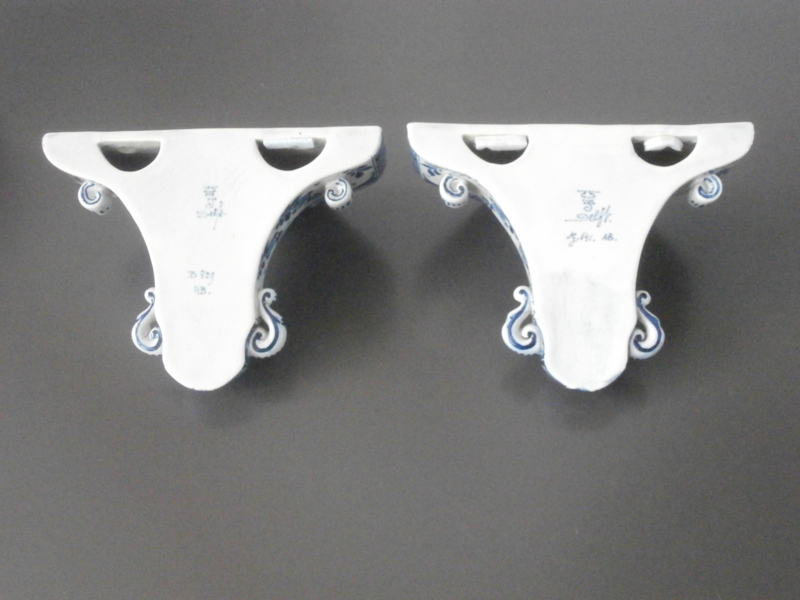 Een set consoles van De Porceleyne Fles die alleen gemaakt werden tussen 1890 en 1918. Daarna werd dit voorwerp te luxueus geacht voor verkoop. Dit model Consoles D 92, is prachtig gedecoreerd, zowel qua schilderwerk als met toegevoegde keramieken versieringen. één exemplaar is al zeldzaam, laat staan een stel dat uit herzelfde jaar komt en pr5achtig gedecoreerd isdoor dezelfde schilder. De prijs is voor de set, die waarschijnlijk al die jaren bij elkaar is geweest.