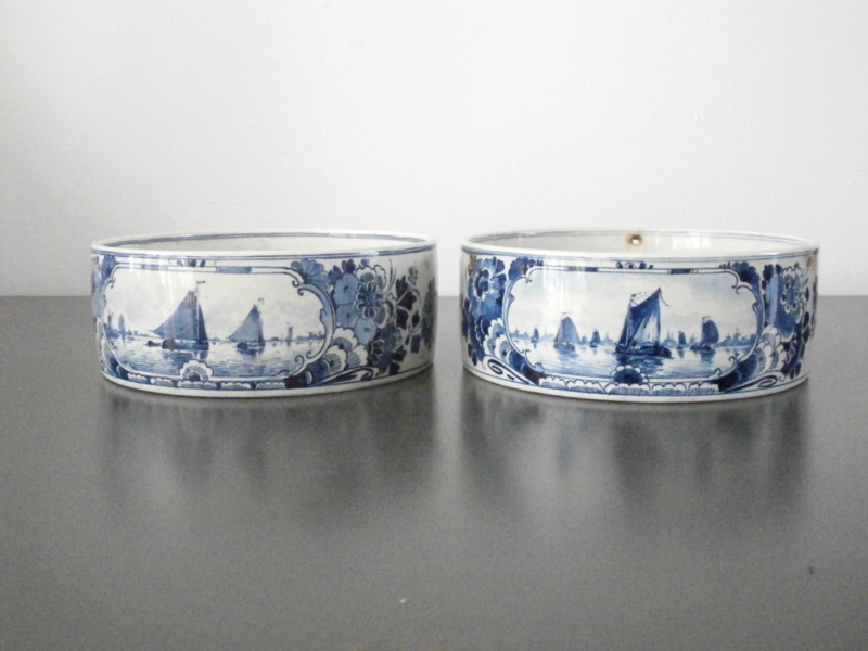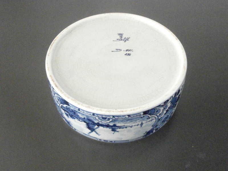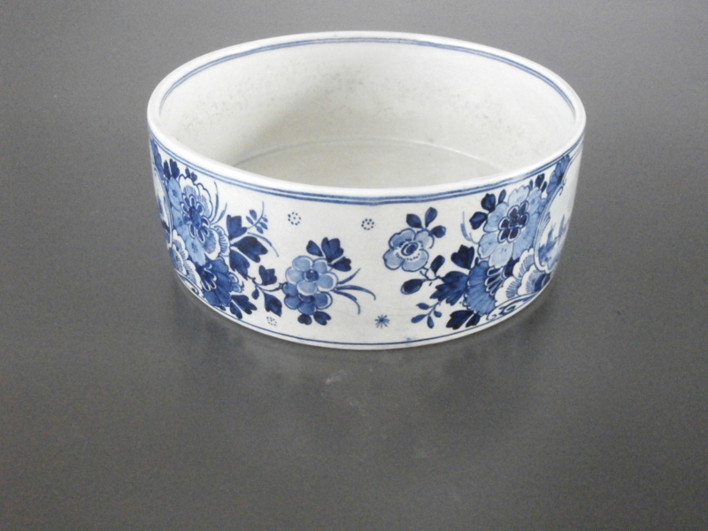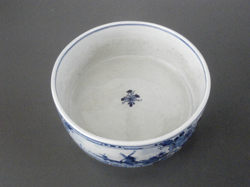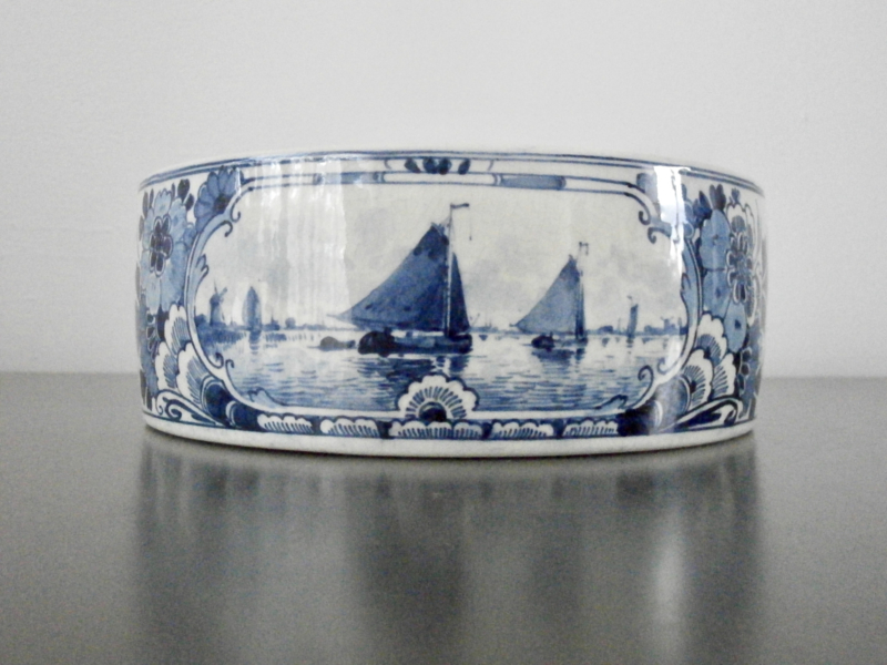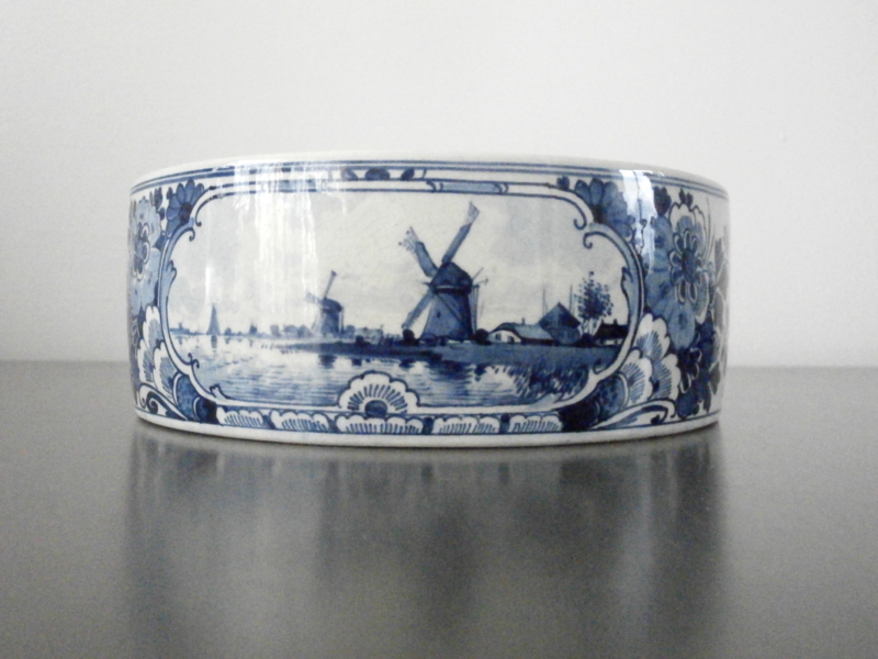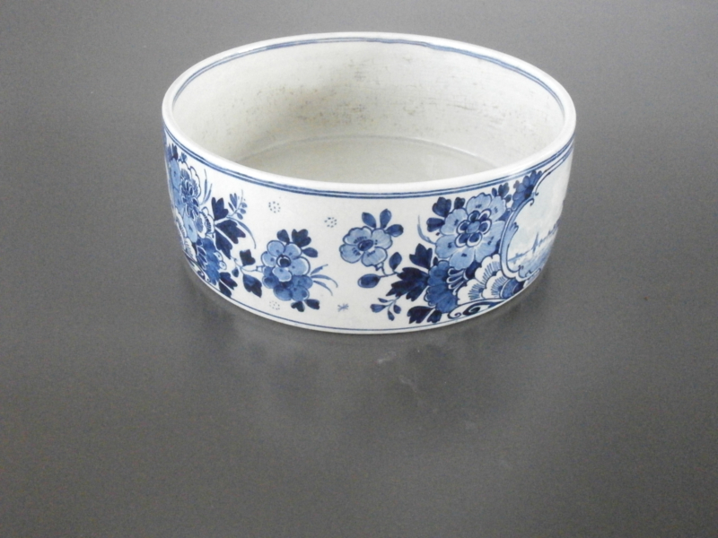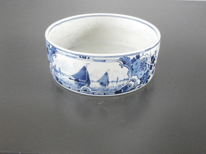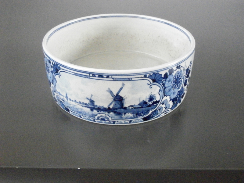Een vroeg stukje van De Porceleyne Fles is dit gladde multifunctionele schaaltje. Het is maar korte tijd geproduceerd rond 1900-1920, als model VII 25 Jardinière nr 8. Dus een plantenschaaltje. De decoratie bestaat uit twee cartouches met een molengezicht en een waterlandschap, daartussen florale motieven. Aan de binnenzijde centraal een bloemetje op de bodem